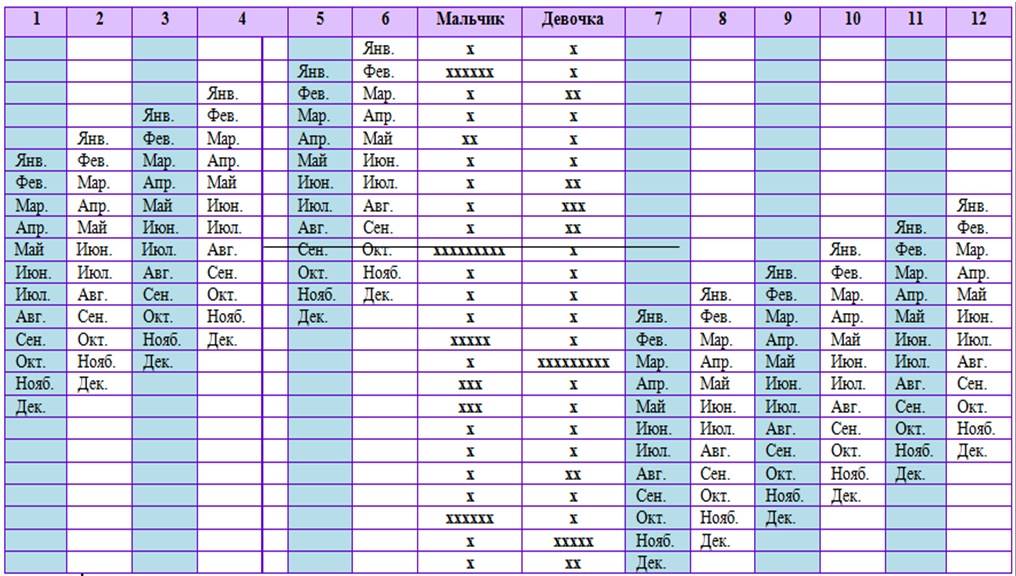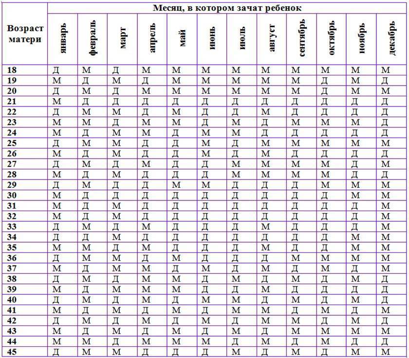 Найдите свой возраст в первой колонке, сопоставьте его с месяцем зачатия в первой строке таблицы и на пересечении узнайте, кого ожидать. Д — девочка, М — мальчик.