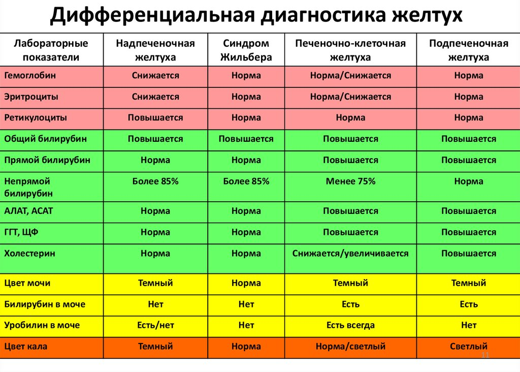 Все эти показатели помогают правильно поставить диагноз при желтухе, найти ее причину (см. таблицу).