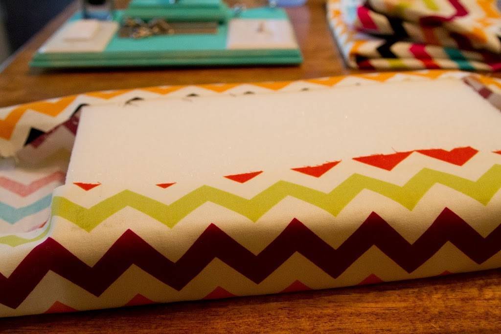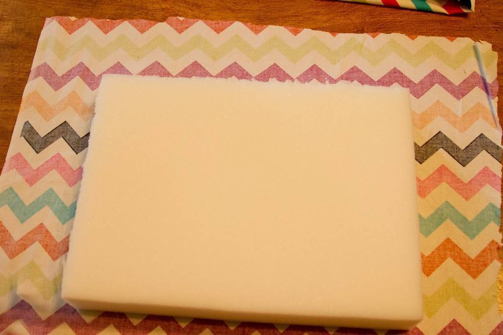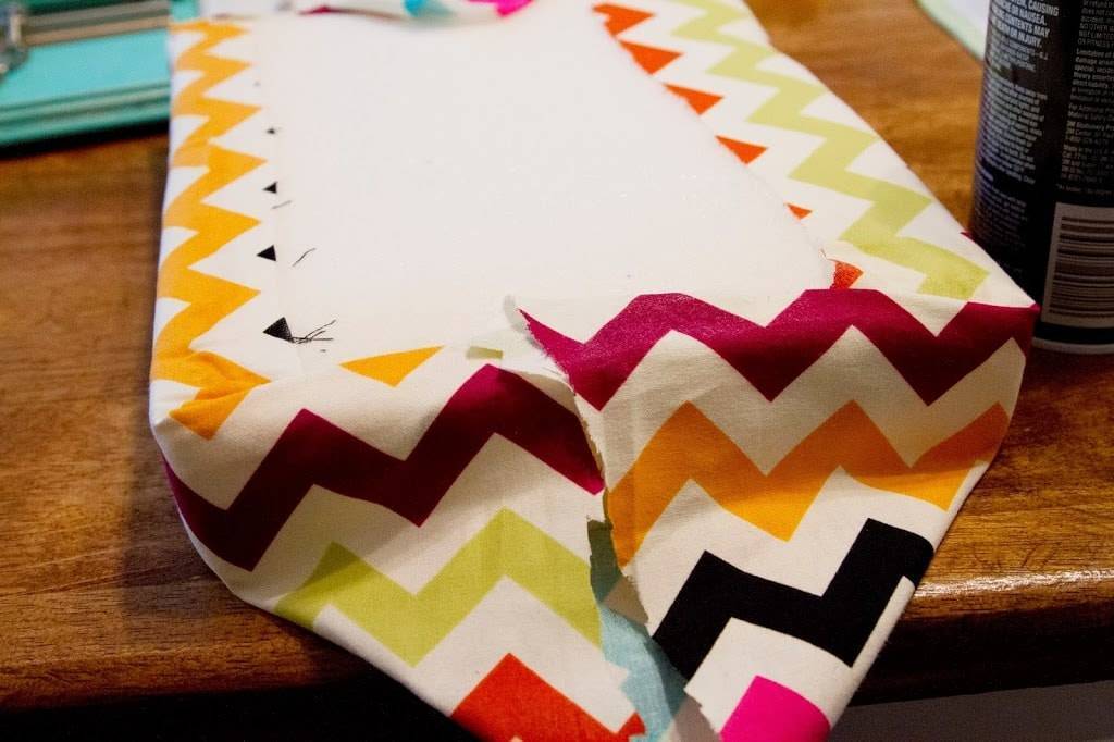 Аккуратно загибаем два края и фиксируем ткань на поролоне с помощью клея.