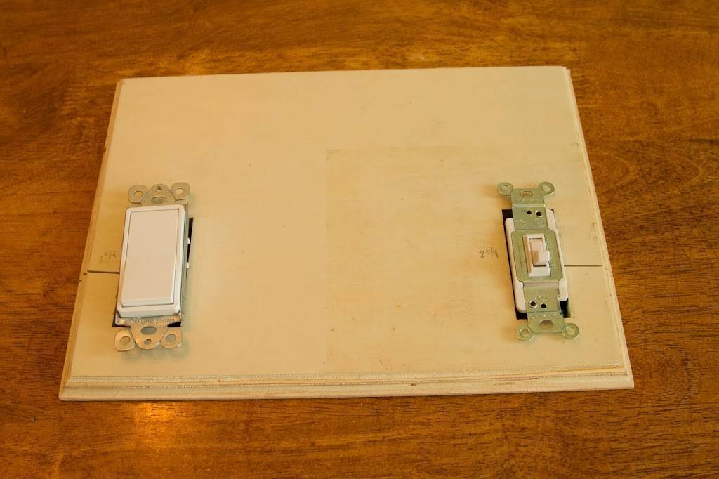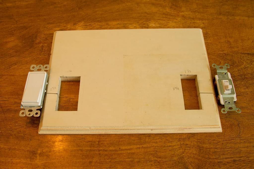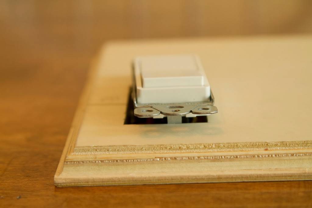 С помощью пилы вырезаем отверстия для выключателей. Окрашиваем доску краской для дерева.