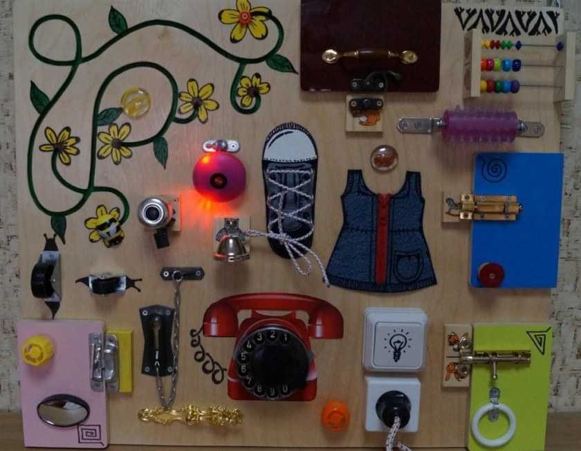 Бизиборд — это специальная доска для развития малыша, на которой расположены различные выключатели, лампочки, замочки, шпингалеты, крючки и многие другие вещи, захватывающие внимание юного исследователя. Кроме этого, ещё на него можно добавить предметы различного цвета, материала и формы
