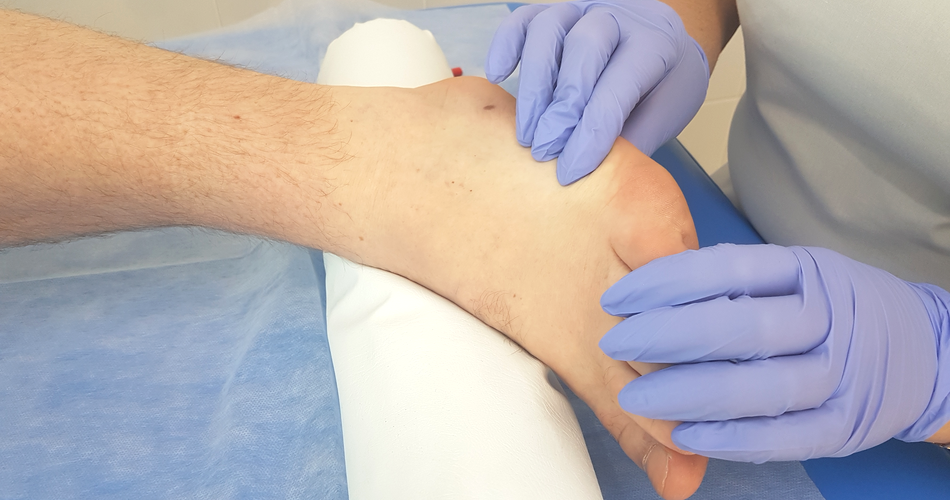 | Врач осматривает стопу пациента болезни Хаглунда-Шинца |