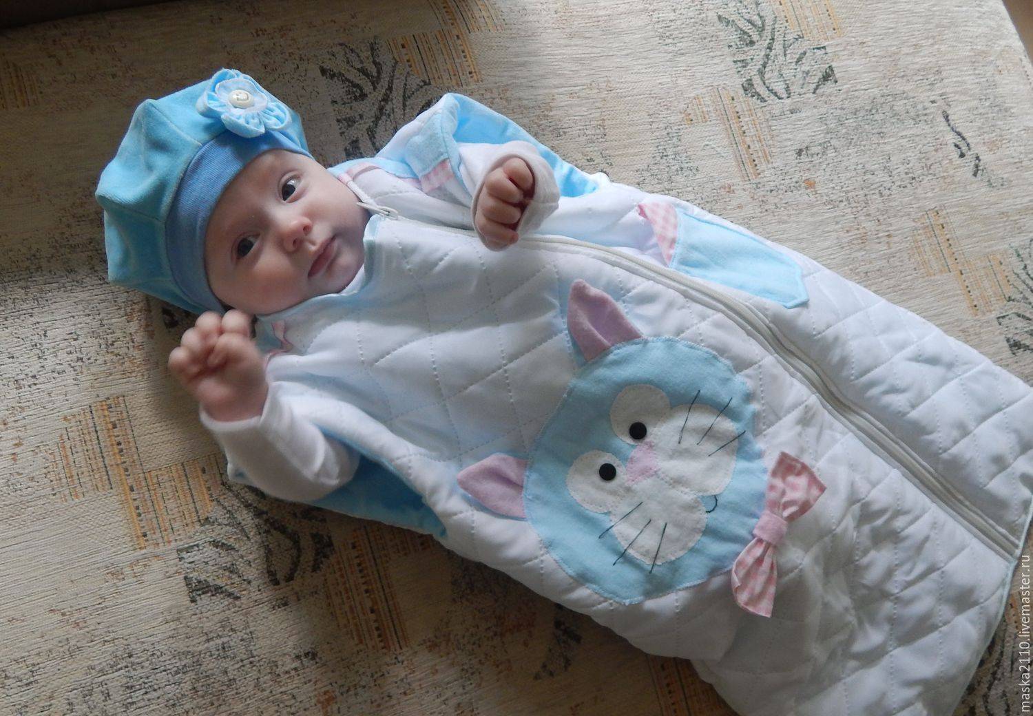 - На пеленание в конверт уйдёт меньше времени. Достаточно разобраться, как перевязать ребёнка лентами, и мама с новорожденным готовы к выписке;