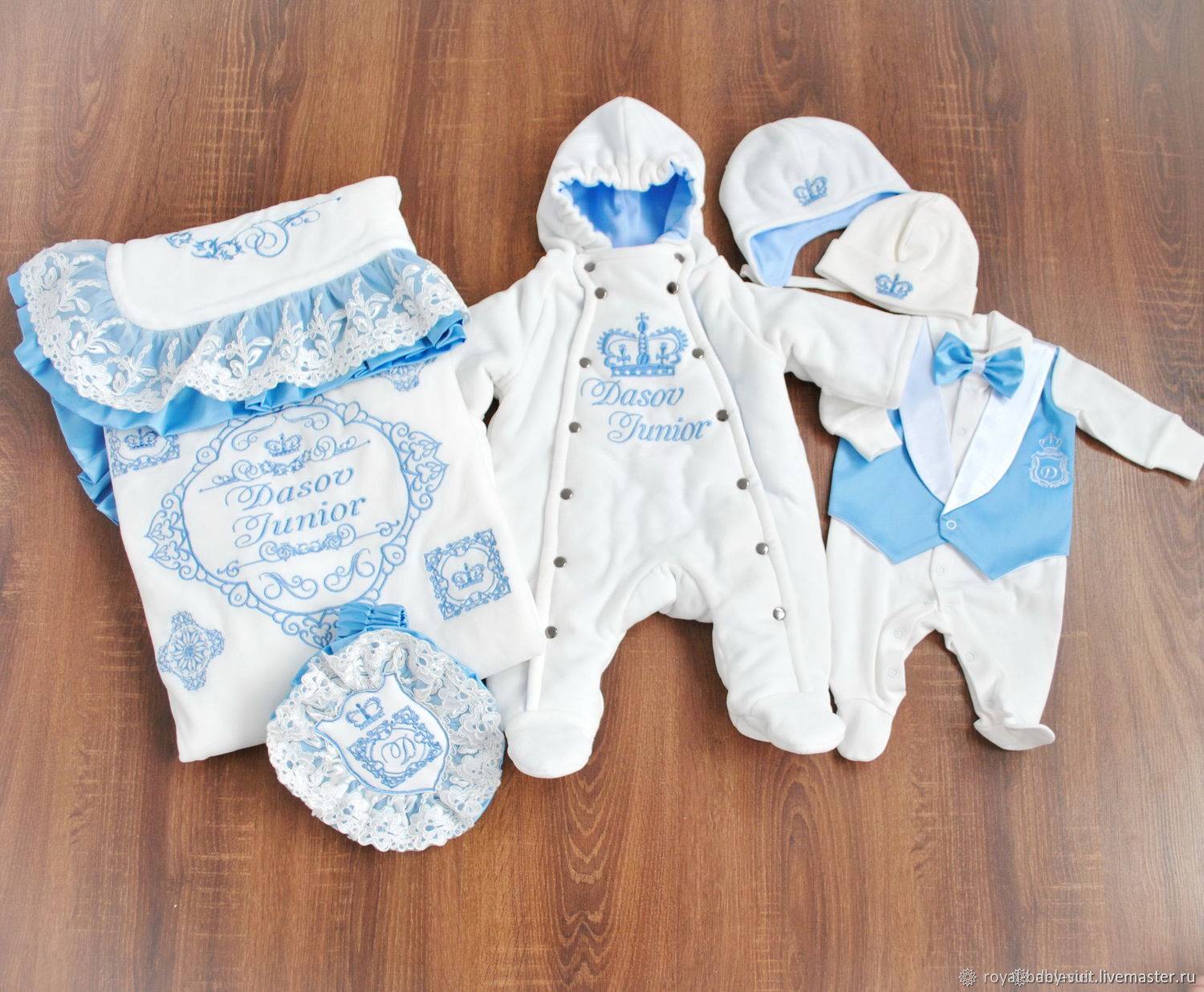 В костюме на выписку из роддома для мальчика присутствуют ровно такие же элементы, как и для маленькой девочки. Отличаются комплекты в первую очередь оформлением.