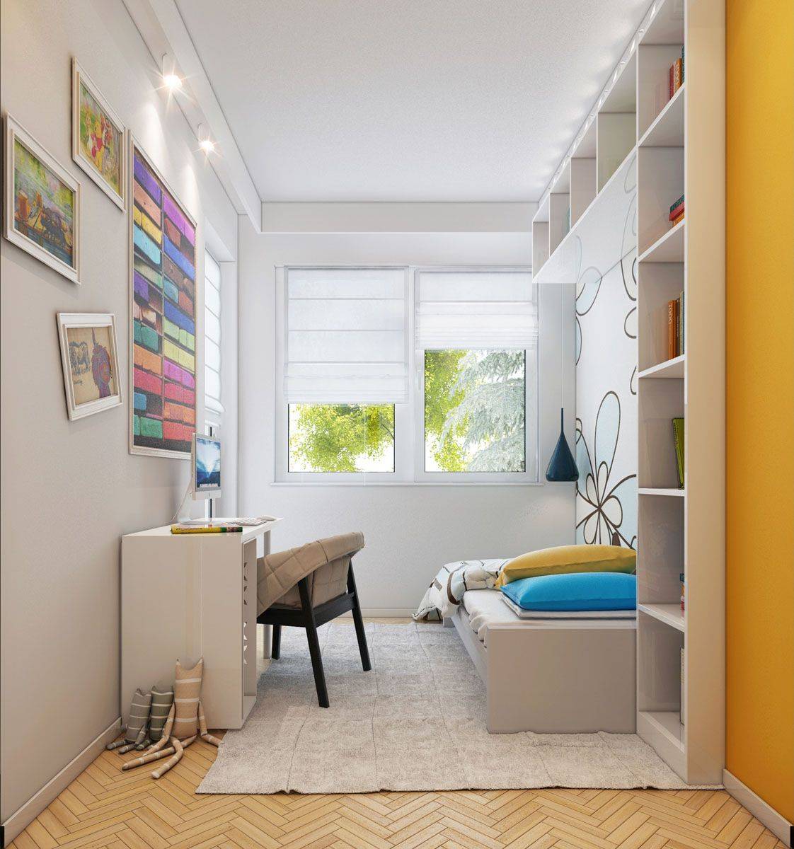 Цветовая гамма в этом случае похожа на стиль модерн. Светлые оттенки в сочетании с насыщенными тонами, примененными локально выглядят одновременно стильно и подчеркивают принадлежность комнаты молодому человеку или девочке.