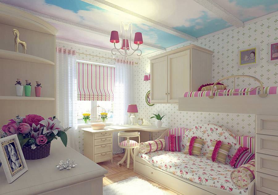 - установка двухъярусной кровати позволит сэкономить пространство и выделить зону отдыха для обеих девочек;