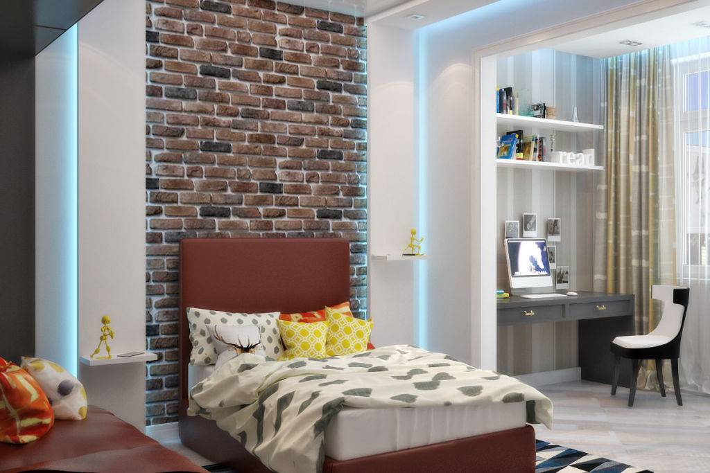 Данное помещение, обязательно должно быть обустроено, как оснащено так и вспомогательной мебелью. Главным элементом считается установка кровати, рабочего стола, шкафа и стеллажа, а второстепенными предметами являются подвесные полочки, диван и зонирующие перегородки.