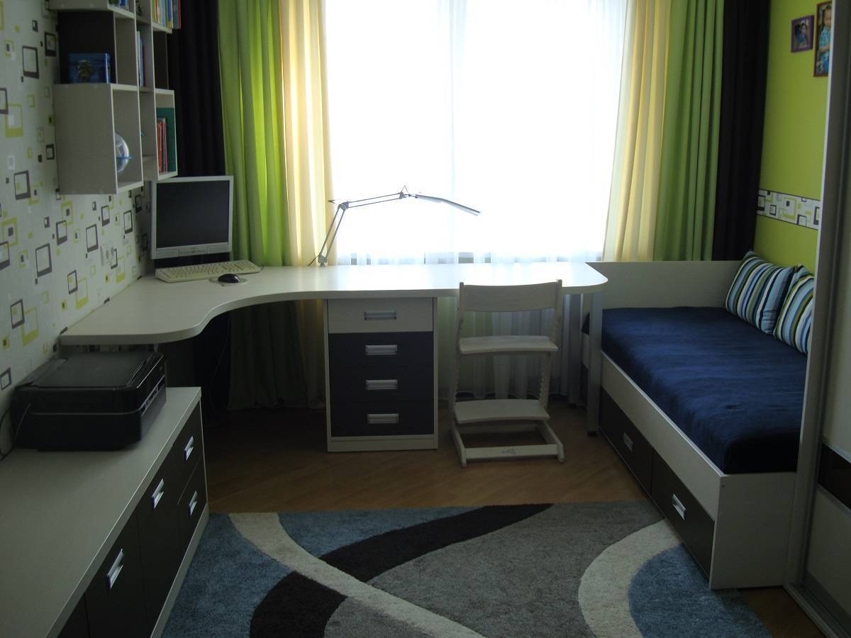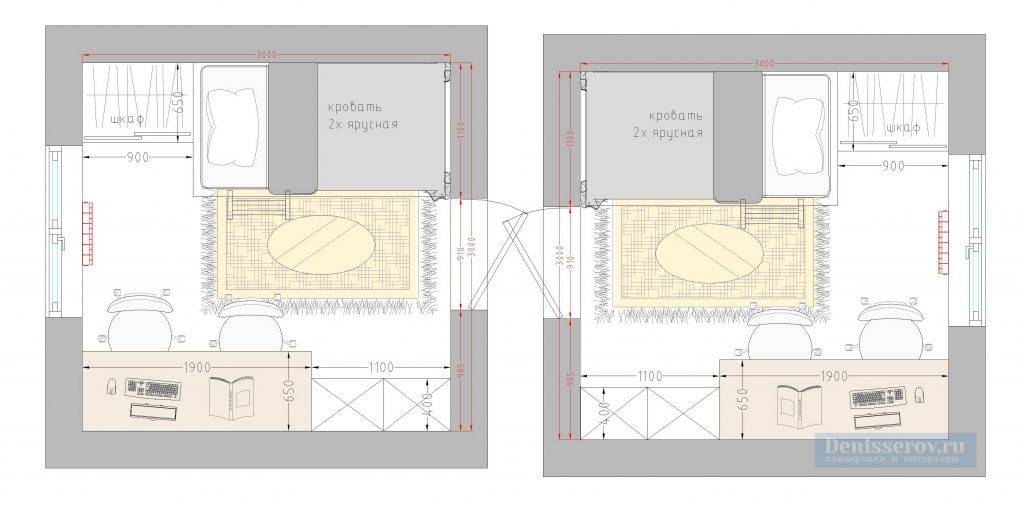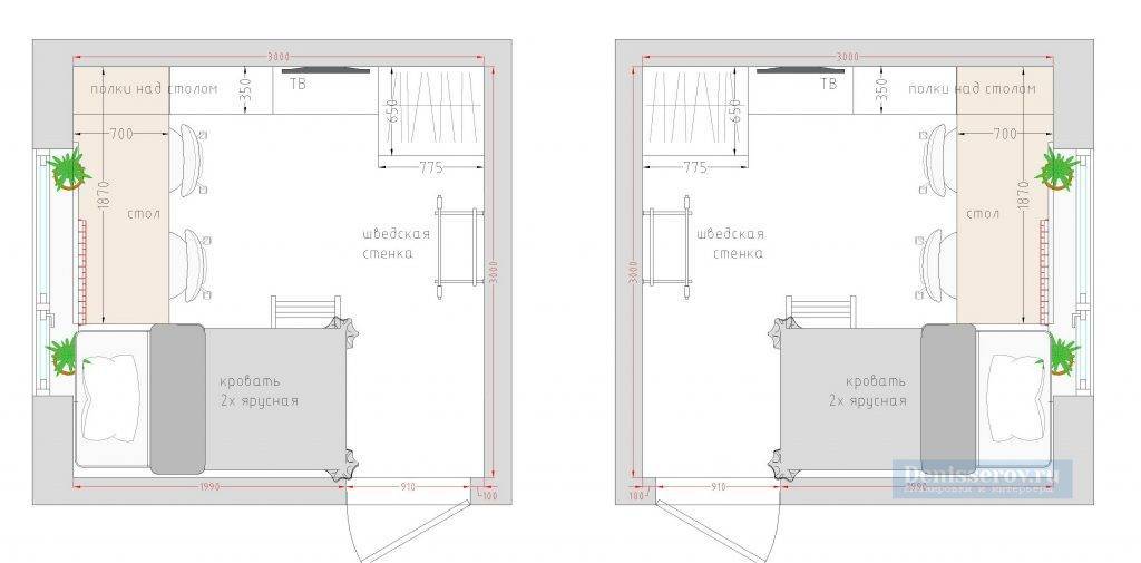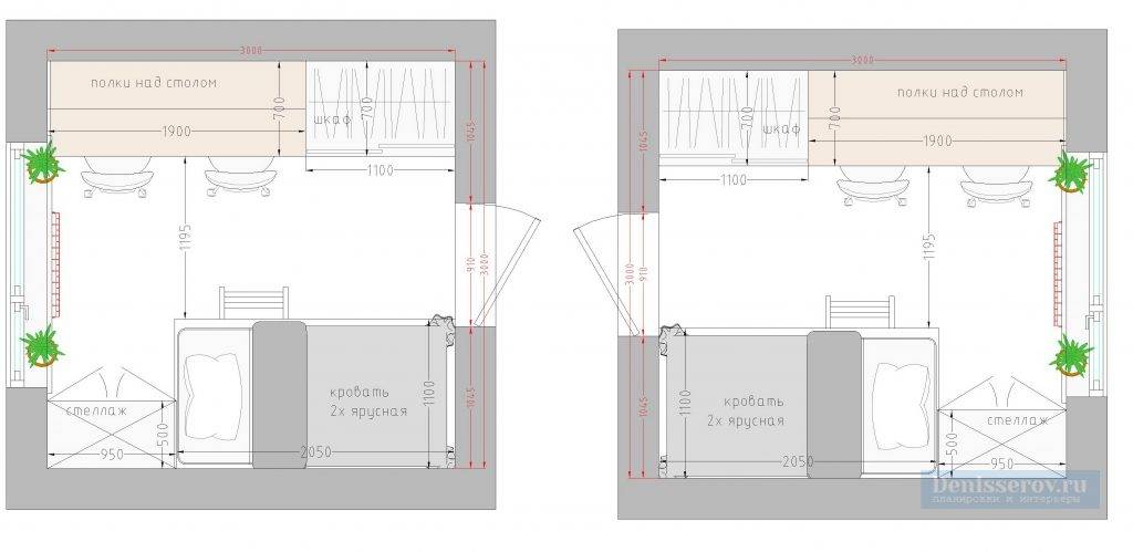 На расположение мебели во многом будет влиять местонахождение двери. Если она прямо напротив окна, то шкафы, кровати и столы можно расставить симметрично вдоль боковых стен. Длина комнаты от 4-5 метров позволит установить кровати на одной линии, разделив их тонкой перегородкой или ширмой. Противоположную же сторону можно использовать под игровую, учебную или спортивную зону.