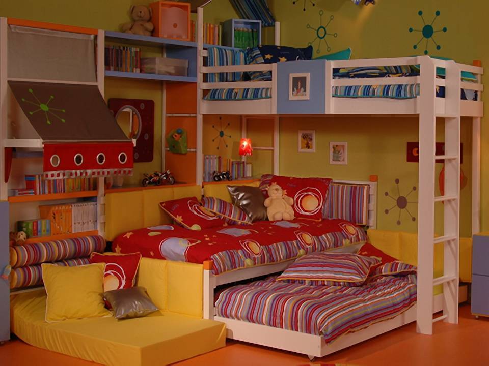 Экономит пространство в детской трехъярусная конструкция. Правда, в таком случае будет не очень удобно менять постельное белье. Кроме того, использовать такой вариант размещения трех детей можно лишь в квартирах и домах с высокими потолками.