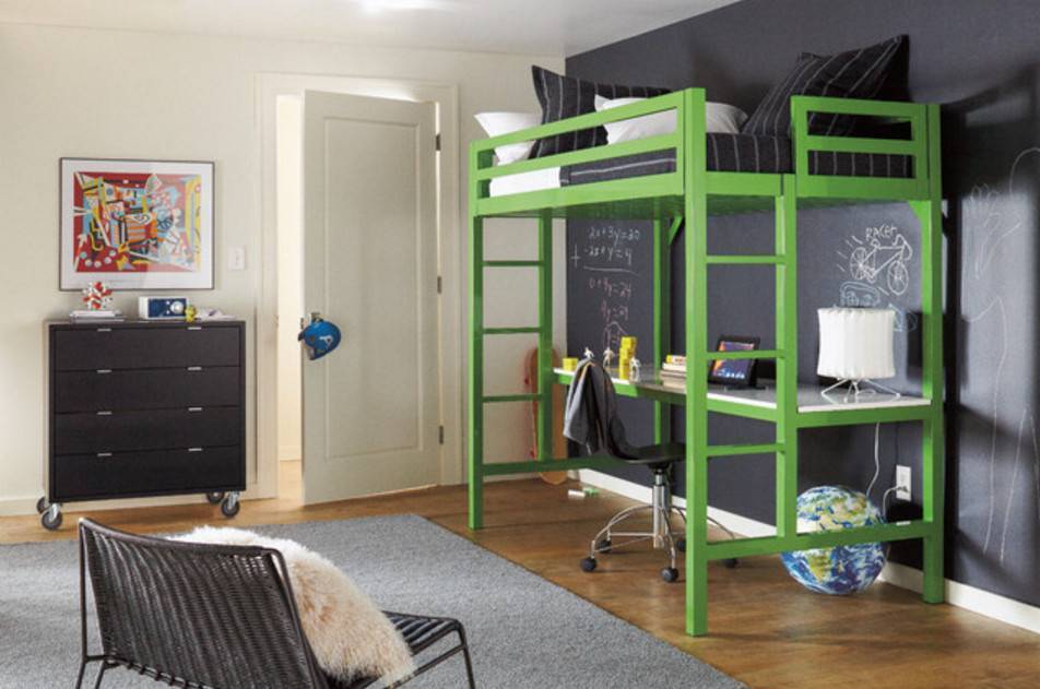 Подойдет кровать-чердак, которая представляет собой двухуровневую систему: ее нижний ярус – это письменный стол либо шкаф для хранения вещей и рабочих принадлежностей, верхний ярус – кровать.