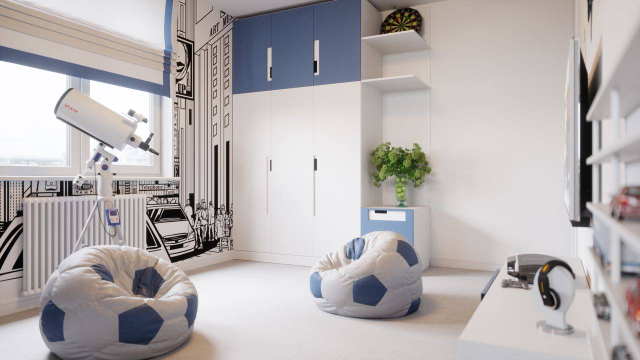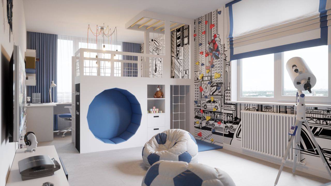 Комната для мальчика 5 лет. Здесь есть все: спальное и рабочее место, спортивный уголок, полки для хранения игрушек, телевизор и даже телескоп! Такой интерьер будет актуальным и для маленького ребенка, и для подростка.