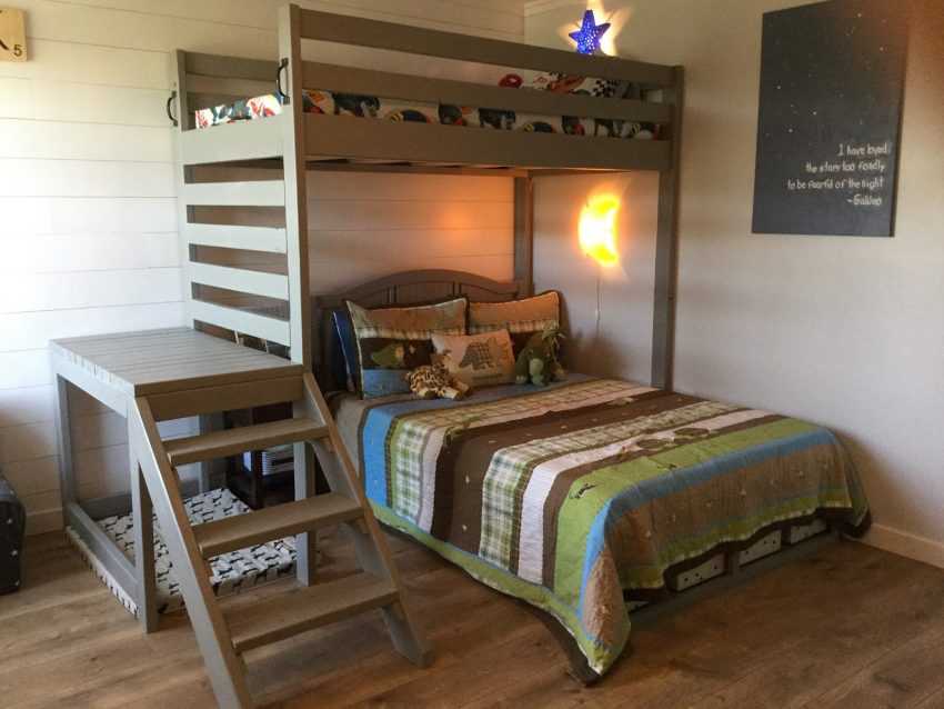 - В зоне для малышей поставьте двухъярусную кровать с нижней частью, предназначенной для развлечения,