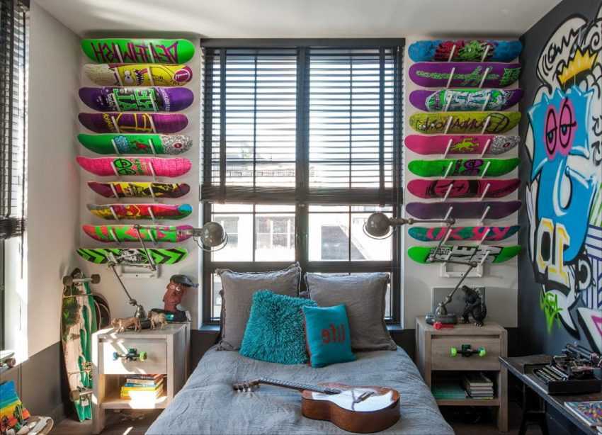 Также следует позаботиться о правильных дополнениях к молодежной комнате для мальчиков – графические узоры, оригинальные плакаты и интригующие наклейки на стенах будут интересным украшением.