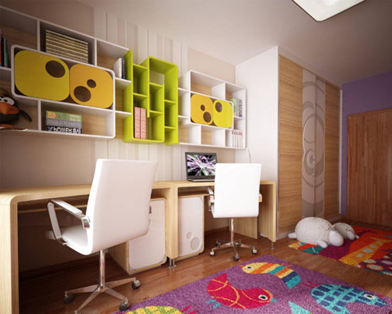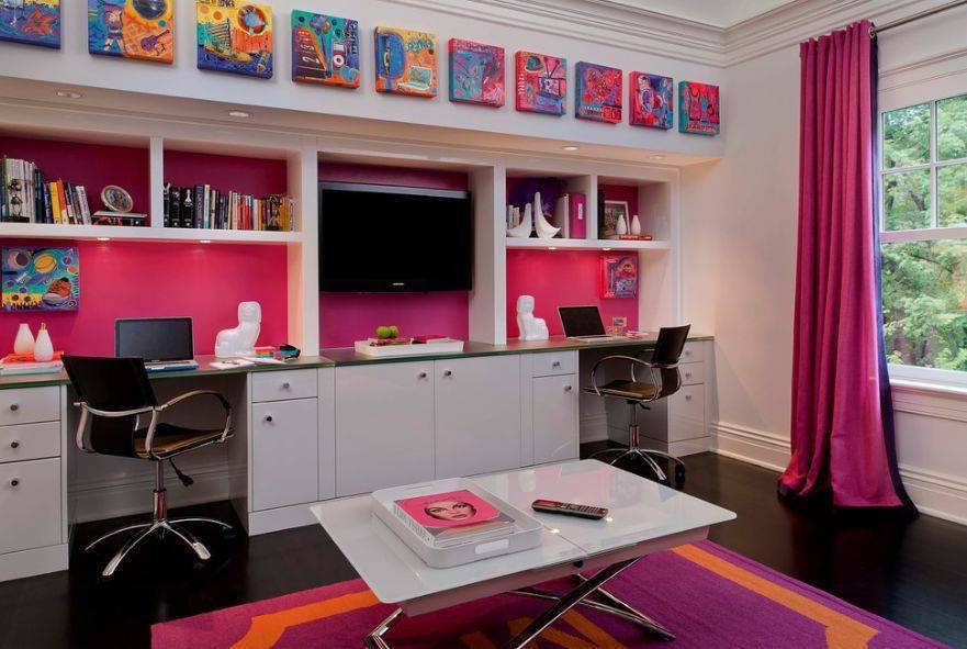Здесь нужны шкафчики для каждой из девочек, множество полочек, функциональные места для занятий и хорошее освещение. Для рабочего стола не требуется много места, ведь современные мониторы предельно компактны, а учебники разместятся на полках. Удачные примеры рабочей зоны приведены на фото.