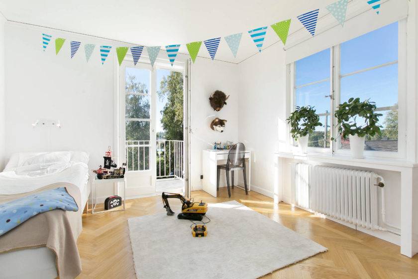 Добавить насыщенности в нордический дизайн спальни получиться с помощью разных игрушек в виде машинок, паровозов и плюшевых зверушек. В качестве декора будет уместно применение морских, сигнальных флажков, глобуса или карты.