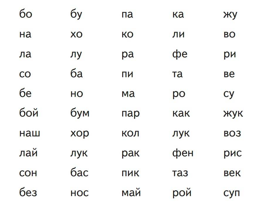 Постепенно развивается умение читать по-сложно слова. Такой метод применяется для детей, страдающие дислексией. В этом случае обучить классическими методами чтения крайне сложно. Для этого существуют слоговые таблицы, выглядящие таким образом:
