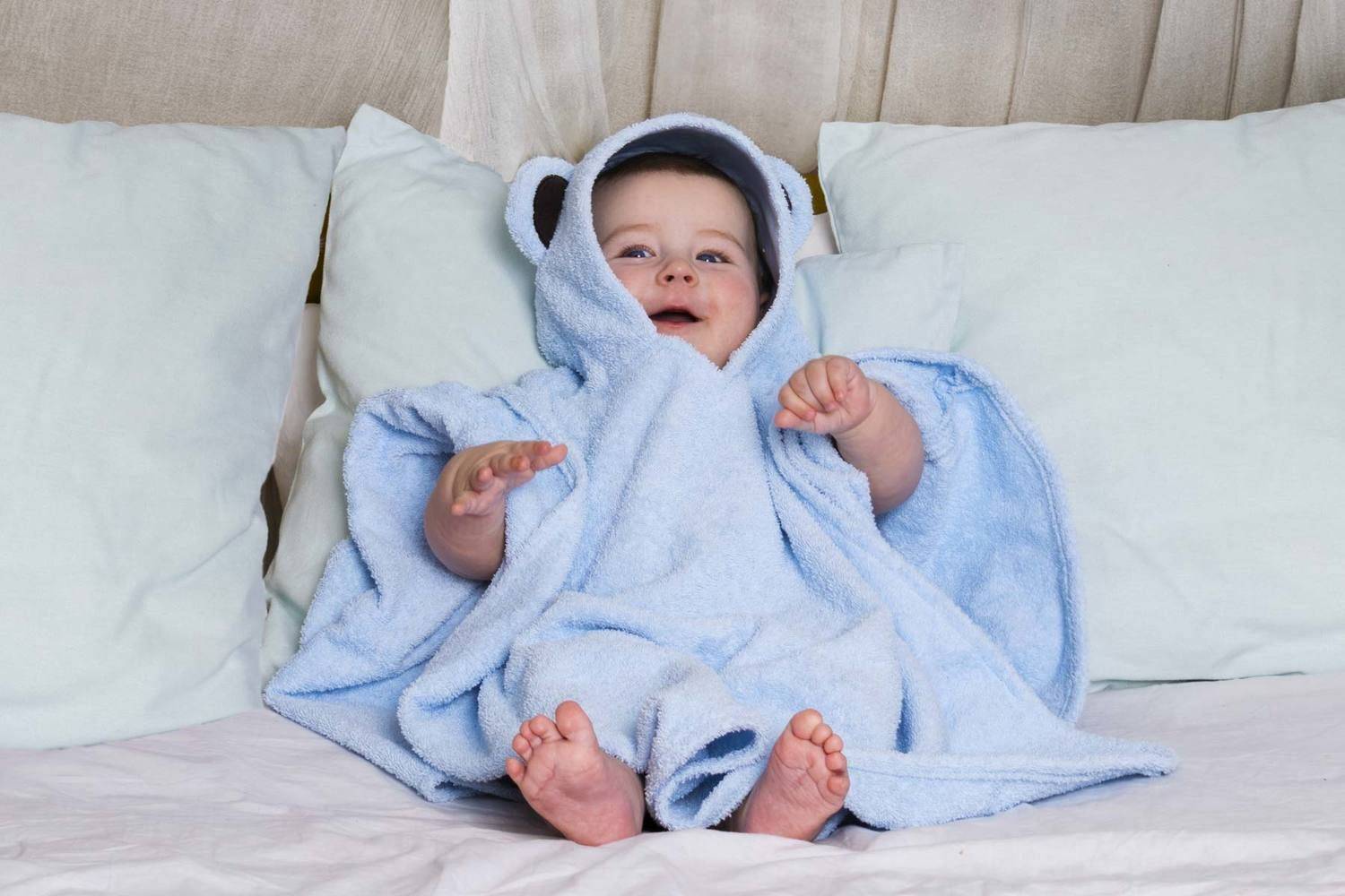 У ребенка обязательно должно быть свое полотенце, которым не будет пользоваться никто, кроме него. Лучше, если оно будет большого размера с капюшоном. Оно прослужит дольше, и вытирать ребенка после купания им проще. Для подмывания малыша лучше иметь отдельное маленькое полотенце, которое хорошо впитывает и мягкое на ощупь.