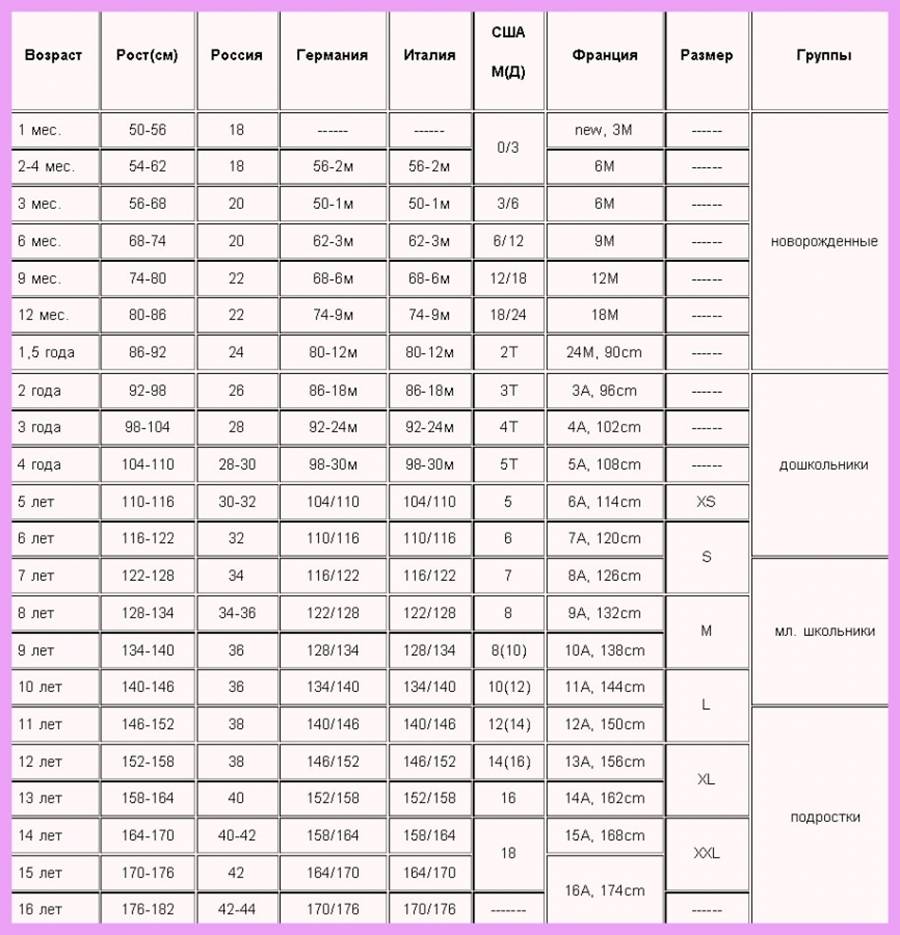 Размер одежды для детей в России определяют по росту, а в США – по возрасту. Таблица ниже представляет усредненные параметры, которые подойдут большинству детей.