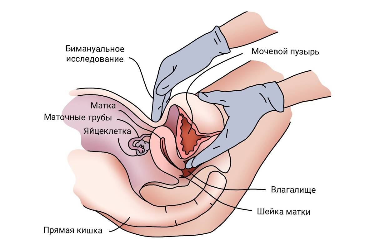 Бимануальное исследование ещё называют двуручным, потому что никакие вспомогательные средства для него не нужны. Врач надевает перчатки, смазывает пальцы лубрикантом и аккуратно вводит во влагалище два пальца одной руки. Другая рука в этот момент находится на животе пациентки. Этот осмотр нужен при жалобах пациентки на любую боль, выделения из влагалища или кровотечения. С его помощью врач может оценить состояние матки и яичников, так как касается их напрямую пальцами. Так можно обнаружить воспаление или нащупать опухоль.