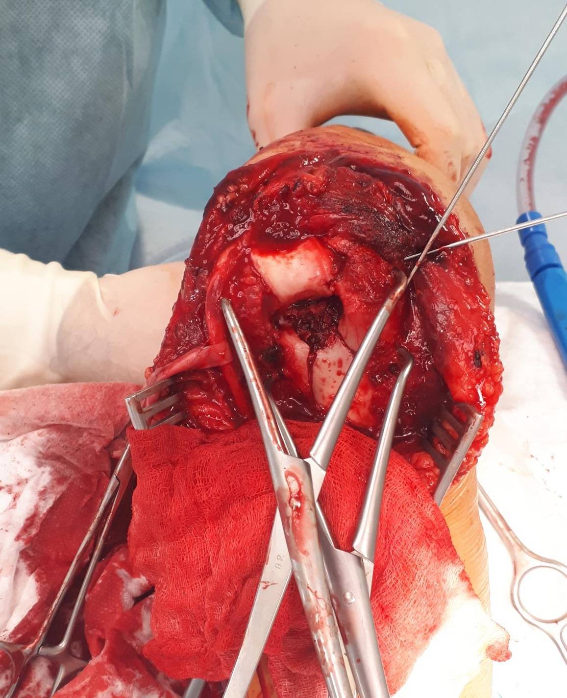 После мобилизации всех отломков становится понятно произошло ли смятие кости, и есть ли возможность адекватного восстановления суставной поврехности, при наличии значительного дефекта кости может потребоваться костная пластика, в случае если этот дефект включает в себя большую часть блока плечевой кости как альтернативный вариант может расматриваться первичное эндопротезирование локтевого сустава.