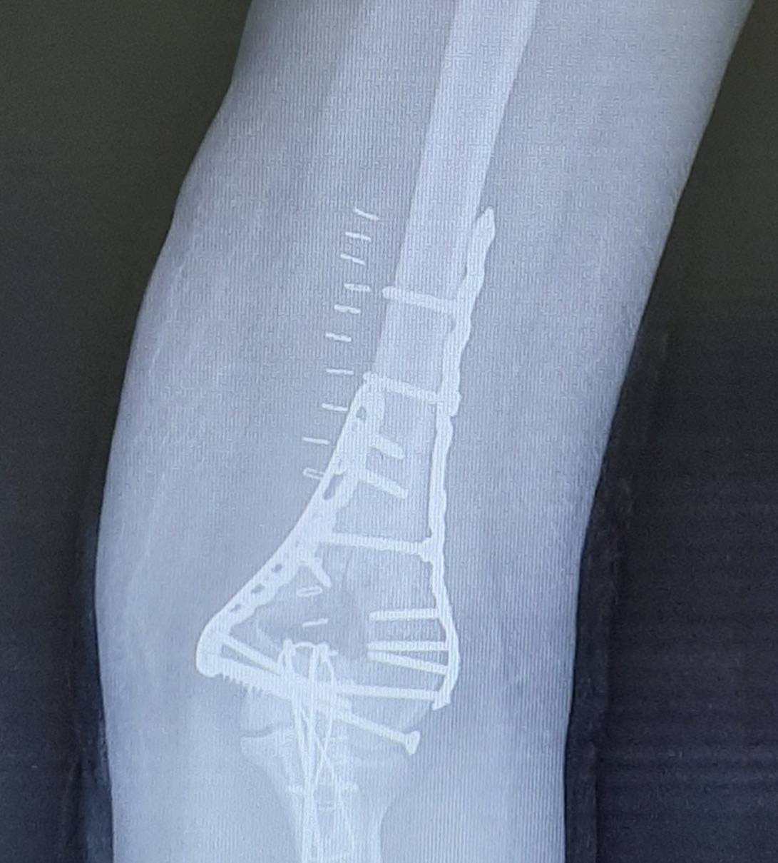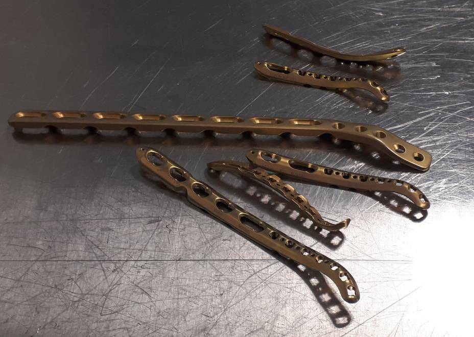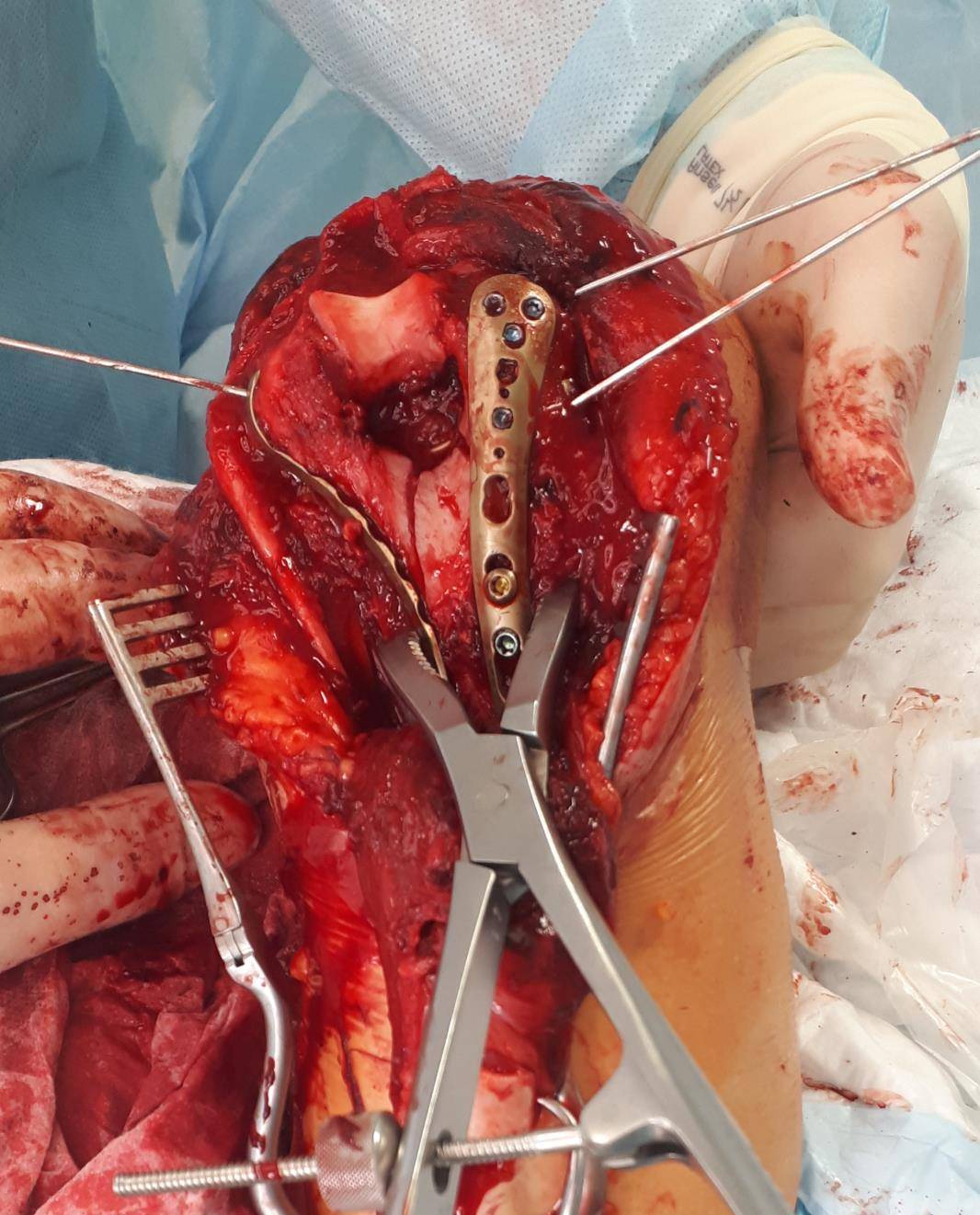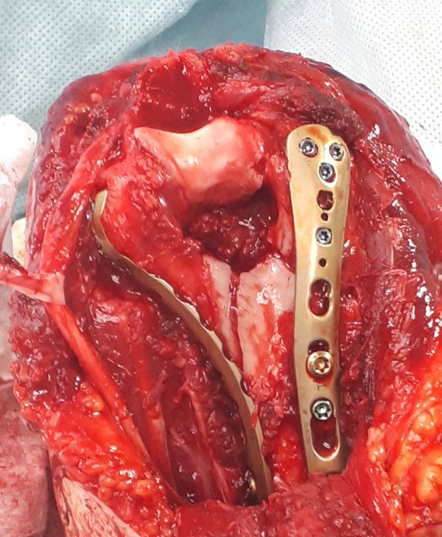 После установки винтов спицы удаляются, так как они уже выполнили свою функцию. Перелом мыщелков плеча надёжно фиксирован винтами и двумя пластинами с угловой стабильностью.
