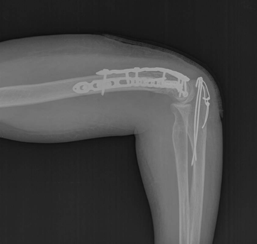 Такой остеосинтез достаточно надёжен для того, чтобы начать реабилитационные мероприятия уже на следующий день после операции. Ранняя мобилизация локтевого сустава препятствует образованию спаек и позволяет восстановить максимально возможную амплитуду движений в локтевом суставе, что и является целью лечения.