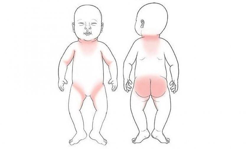Опрелости. Это раздражение кожи, которое проявляется в виде красных воспаленных пятен в области ягодиц и гениталий ребенка, а также в складках тела – паховых, подмышечных, шейных. Присоединение грибковой инфекции может усугубить ситуацию. Другая распространенная причина опрелостей — воздействие стула и мочи. Жесткое мыло, пот, влага или слишком тесные подгузники также вызывают раздражение или ухудшают существующую опрелость.