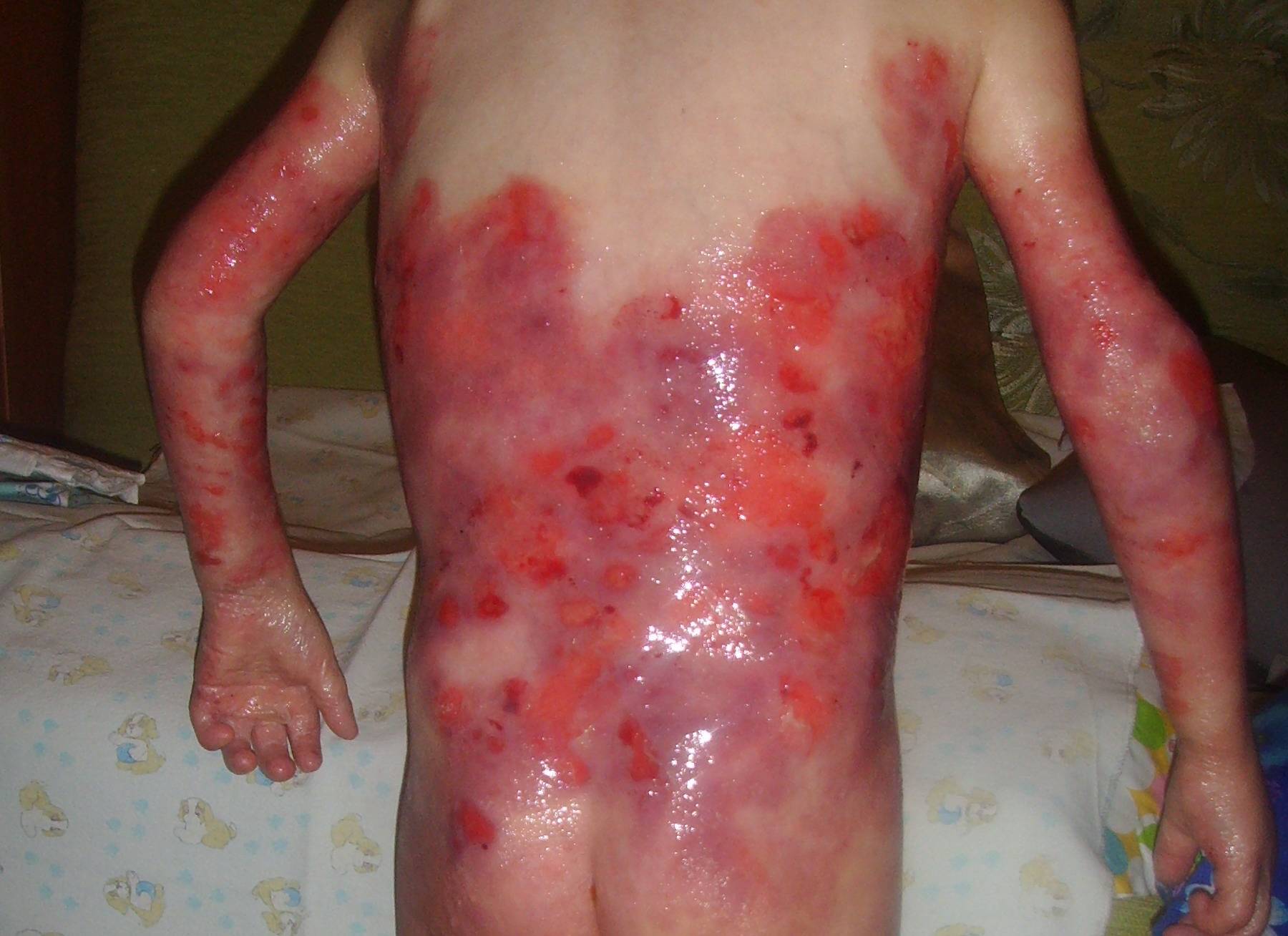 Эрозии и мокнутия в области пальцев приводят к тому, что рубцовая ткань образуется со срастанием пальцев. В таком случае кисти ребёнка навсегда теряют функцию захвата.