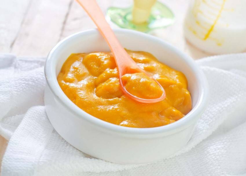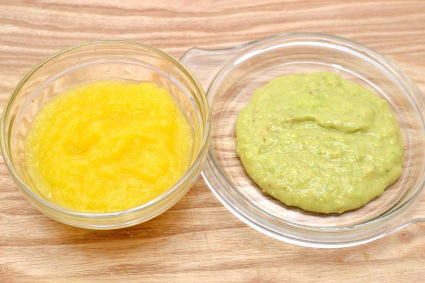 Выбранные для прикорма продукты нужно обязательно перемалывать в пюре и давать ребенку с ложечки. Пюре сразу из нескольких компонентов можно вводить в рацион после того, как малышу исполнится 6 месяцев, а поначалу овощное или фруктовое пюре должно состоять только из одного продукта и предлагать его ребенку нужно в ограниченном количестве.