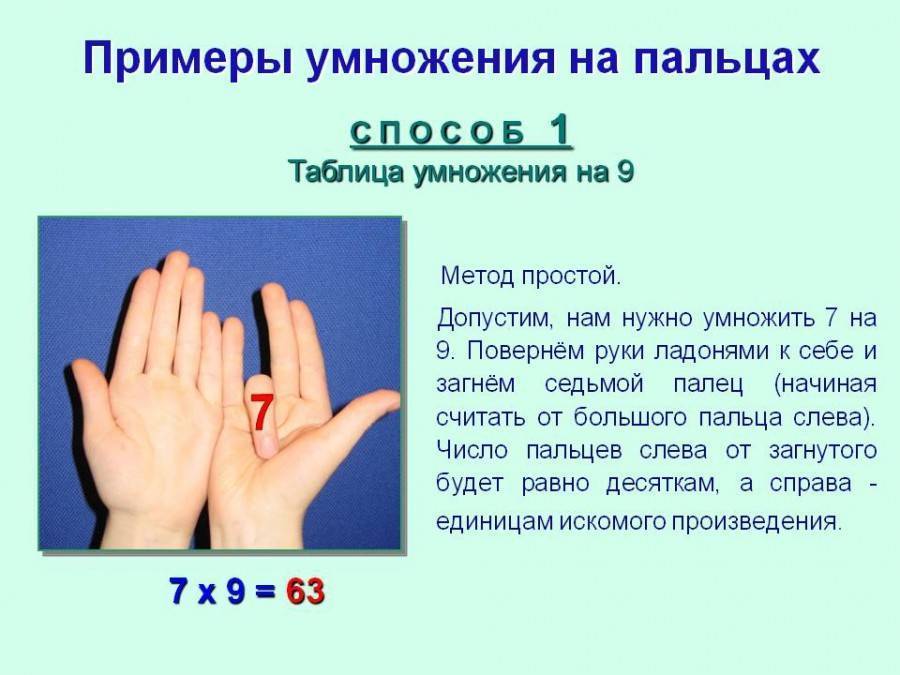 Расположите кисти рук перед собой ладонями наружу и пронумеруйте их мысленно от 1 до 10, начиная с левого мизинца. Табличные примеры на умножение с числом 9 решаются очень просто: достаточно загнуть палец, номер которого совпадает со вторым множителем.