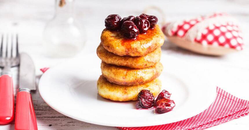 - Готовые сырники выкладываем в тарелку и добавляем любимый подсластитель. Можно подать их к столу с фруктово-ягодным пюре.