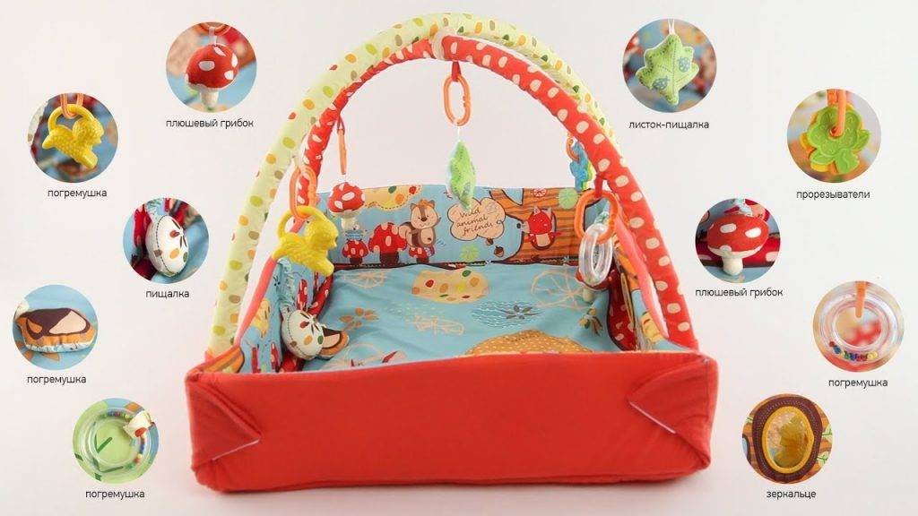 К таким конструкциям крепятся элементы, которые позволяют развивать концентрацию внимания, различать цвета. Для детей до года подобные коврики являются своеобразным мини-спортзалом. Младенец будет тянуться ножками и ручками к игрушкам, укрепляя свое физическое состояние.