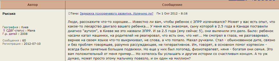 На многочисленных форумах Интернета задается вопрос: “Кто вылечил ЗПРР с элементами аутизма?” Однозначного ответа для всех нет и быть не может.