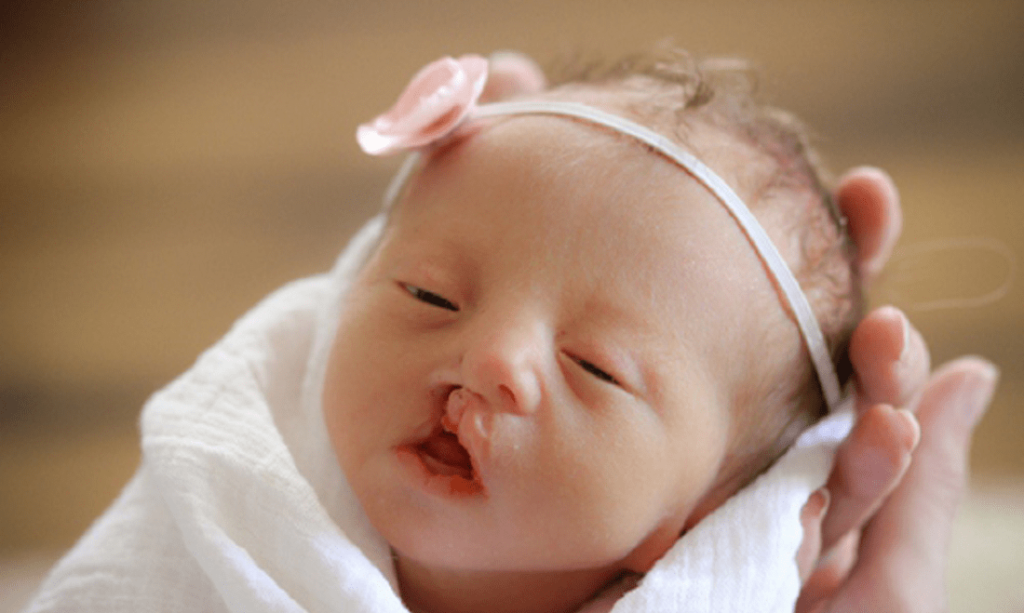 - Нарушения на лице: многие дети с трисомией 13 рождаются с расщелиной губы и/или неба. Глаза бывают расположены друг к другу вплотную и могут соединяться, образуя один глаз. Уши могут находиться низко, распространена аплазия кожи на голове (отсутствие кожного покрова).