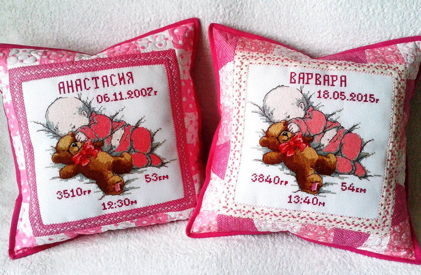 Чаще всего метрика оформлена в рамку. Если речь идёт о подушке, она украшена декоративными элементами. Мамы охотно создают такие шедевры самостоятельно или заказывают у мастериц.