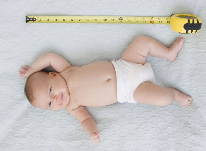 Измерение длины тела грудного ребенка проводится с помощью сантиметровой ленты. Малыша укладывают на стол или кровать так, чтобы его голова упиралась в бортик. Выпрямив ножки крохи, отмечают линию под пятками и измеряют расстояние от бортика до этой линии. Рост ребенка постарше определяют с помощью ростомера.