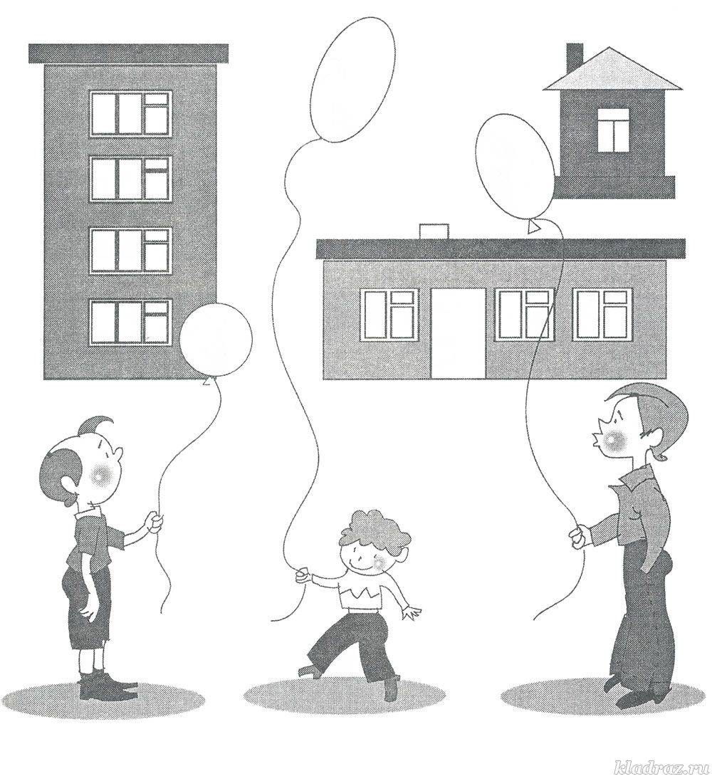 Самый высокий из этих троих мальчиков живет в самом маленьком доме, мальчик пониже — в самом длинном доме, самый низкий мальчик — в самом высоком доме. Проведи от каждого мальчика стрелку к дому, в котором он живет. Раскрась шарик с самой длинной ниточкой красным цветом, шарик с ниточкой покороче — синим цветом, а шарик с самой короткой ниточкой — желтым цветом.