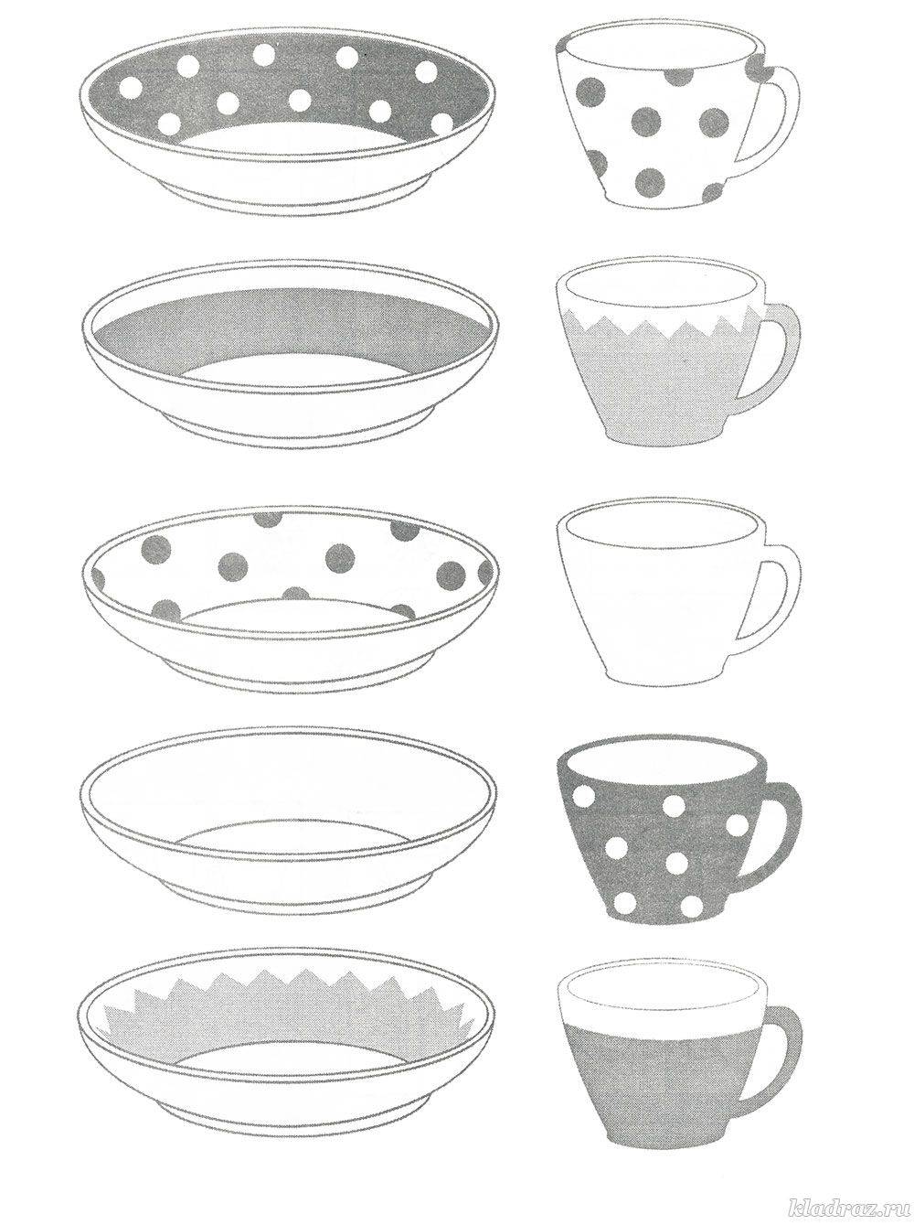 Подбери пары (чашечки с блюдцами). Раскрась нужную пару своим цветом.