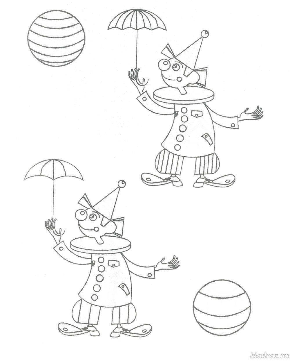 У какого клоуна штаны в широкую полоску, а у какого — в узкую? На каком мячике узкие полоски, а на каком широкие? Раскрась зонтик с широкими полосками красным цветом, а с узкими — зеленым.