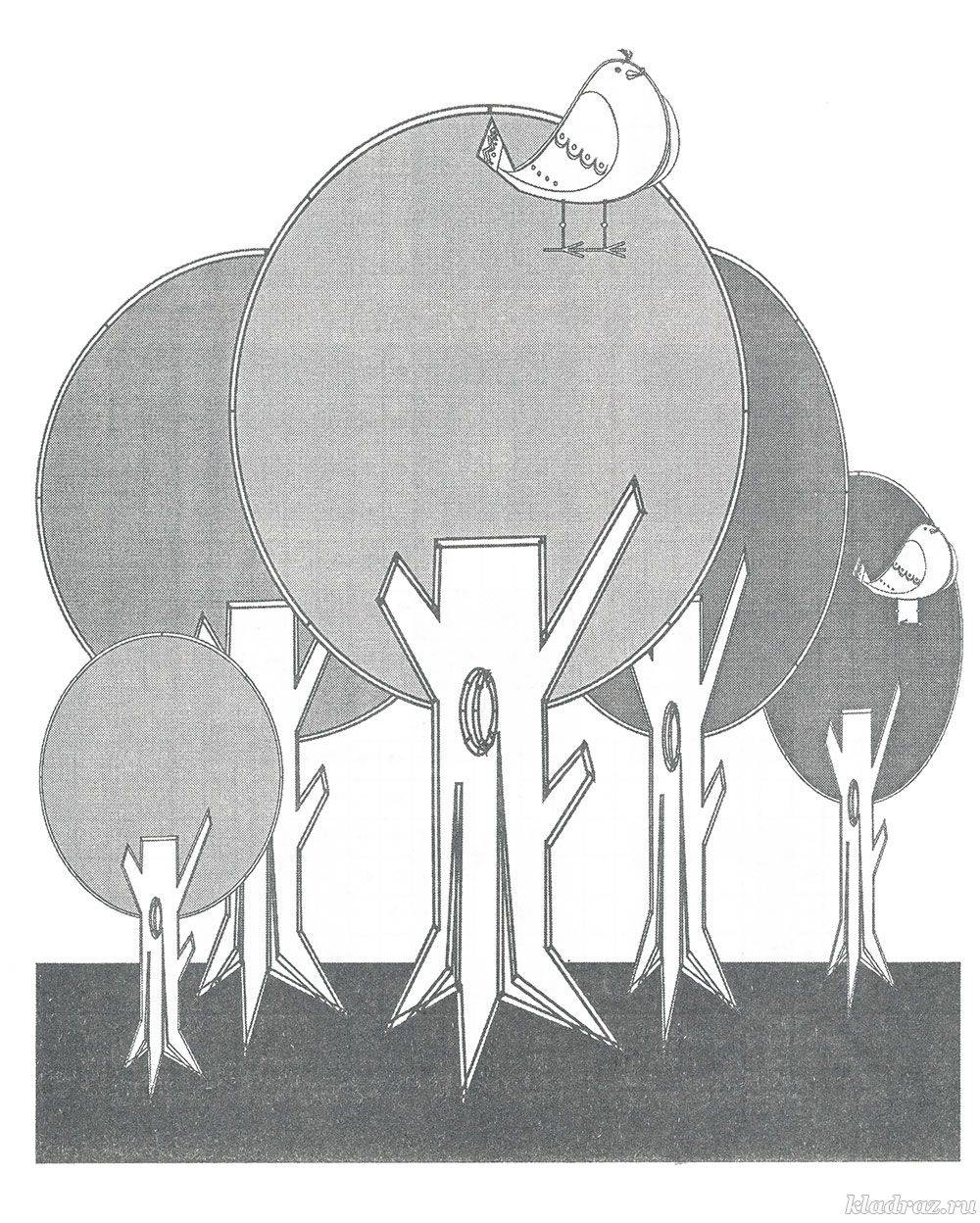 Раскрась птичку, которая сидит на дереве с самым толстым стволом, синим цветом, а птичку, которая сидит на дереве с самым тонким стволом, желтым цветом. Покажи деревья по порядку от самого тонкого до самого толстого.