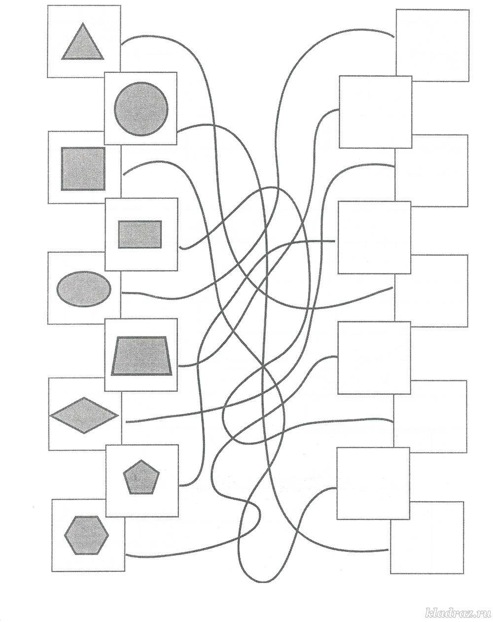 Найди каждой геометрической фигуре ее новое место (пройди по линии до нужного квадратика и нарисуй в нем точно такую же фигуру).