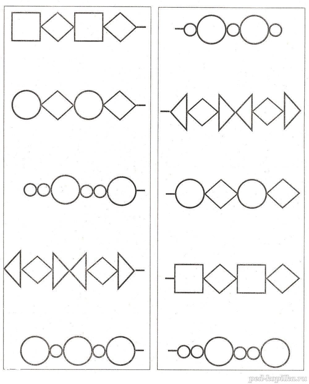 Найди продолжение каждой цепочки. Соедини начало и конец цепочки. Раскрась их. Из каких фигур они состоят?