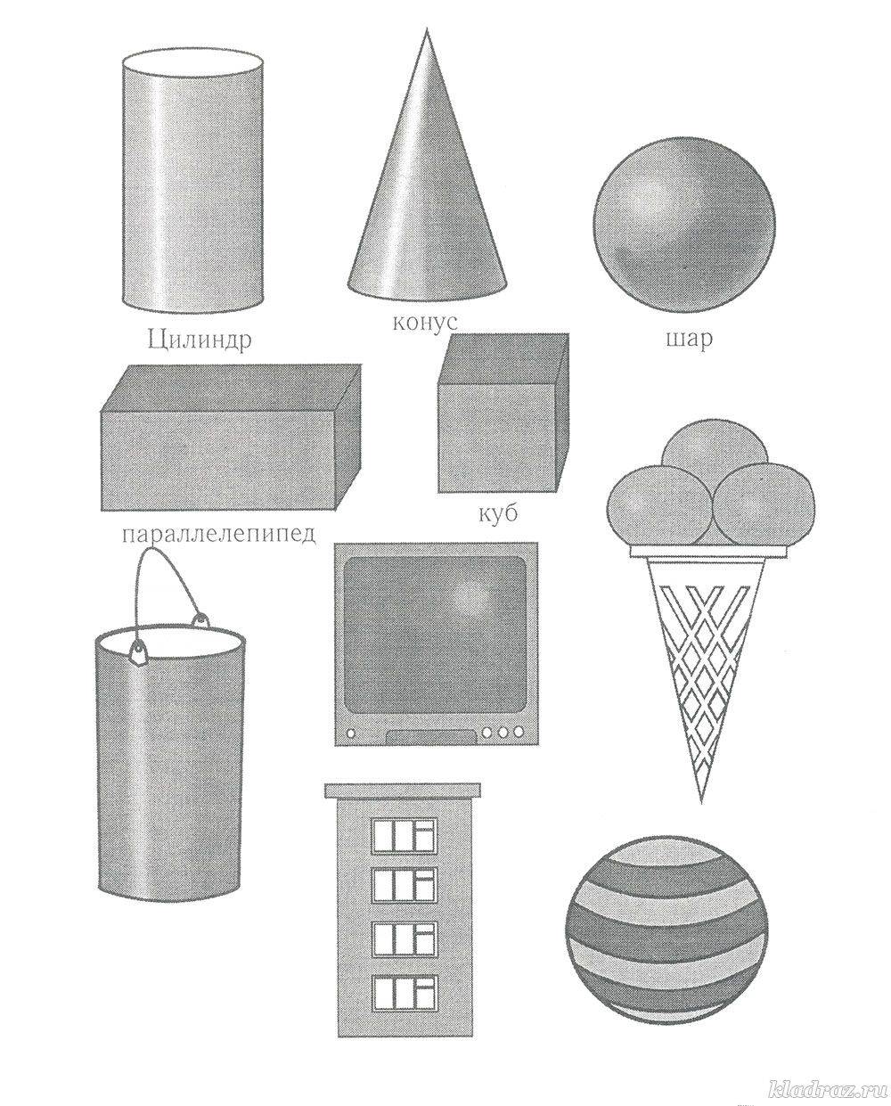 Объемные геометрические фигуры называются геометрическими телами. Назови эти тела и найди похожие на них предметы.