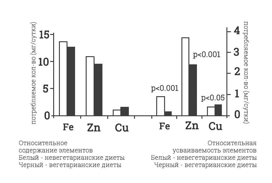 Например, в «Американском журнале клинического питания»опубликованы результаты исследований, сколько усваивалось железа, цинка и меди при вегетарианских и невегетарианских диетах. При примерно сопоставимом содержании этих элементов, из растительной пищи они усваиваются хуже.