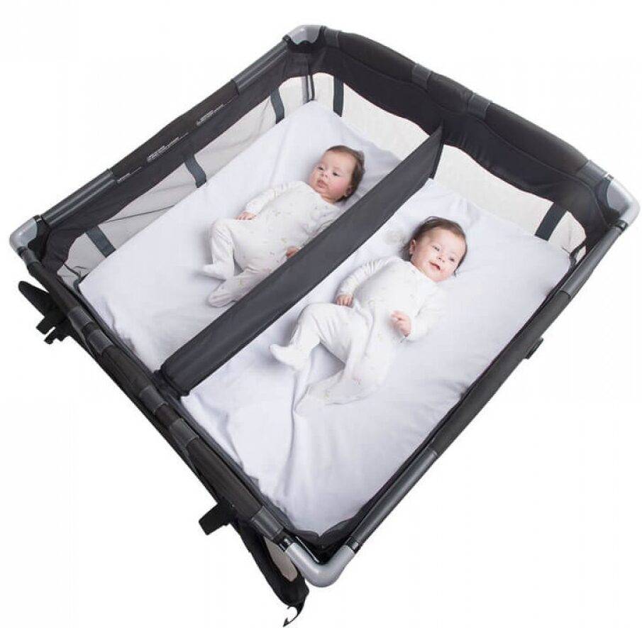 В случае с двойняшками кровать оборудуется двумя люльками, которые можно ставить в манеж, а во время их бодрствования – вытаскивать. Тогда кроватка превращается в обыкновенный манеж для игр повзрослевших деток. В люльках малыши могут находиться до 2-3 месяцев, затем модель регулируется под определённую высоту и служит обыкновенным местом для сна. На боках модели находятся специальные карманы для различных вещей – бутылочек, сосок и памперсов. Иногда производители предлагают в манеже специальный лаз-отверстие, который впоследствии станет игровым домиком.