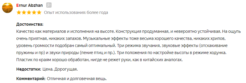 Родители довольны прочностью конструкции, она выдерживает до 30 кг. Здесь мягкое сидение, хорошая поддержка спинки. Музыкальная панель имеет оптимальный уровень громкости. При необходимости ее можно снять.