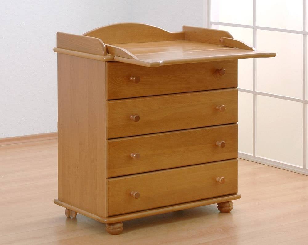 В основном комодики не отличаются особыми характеристиками друг от друга. Имеют выдвижные ящички, а пеленальная доска крепится сверху. Она легко снимается, и когда малышу не требуется пеленальный столик, остается просто комодик для детских вещей. Материалом для изготовления служит дерево, или более экономные варианты деревоматериалов.